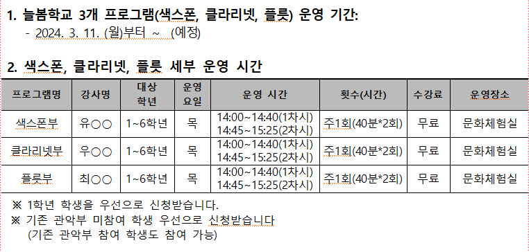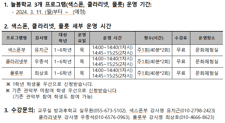 안녕하십니까? 학부모님 가정에 건강과 행운이 늘 함께 하시길 기원합니다. 2024년 경남형 늘봄학교 추진 방안 관련으로 본교에서는 "미래형맞춤형 방과후학교 프로그램"을 아래와 같이 운영하게 되었습니다. 정규수업 외에 방과후 시간을 활용하여 소규모로 수준별 전문 강사의 지도를 받을 수 있고 1인 1악기를 무료로 배울 수 있는 기회를 제공하고자 합니다. 본교 특색교육인 관악부와 연계하여 운영되는 늘봄학교 프로그램을 확인하시어 희망하는 학생들의 많은 신청을 부탁드립니다